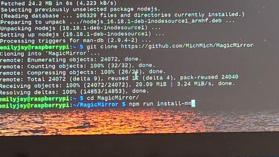 node.js 패키지가 설치가 완료되었으면 매직미러 소스코드를 git hub라는 온라인 저장소에서 라즈베리 파이의 SD카드 영역으로 복사해 오도록 git clone 명령을 통해 복사한다. 소스코드가 복제 완료되면 현재 디렉토리에 MagicMirror라는 디렉토리가 생성되었을 것이다. cd 명령을 통해 해당 디렉토리로 이동한 후에 npm run install-mm 명령어로 매직미러 모듈을 설치한다.