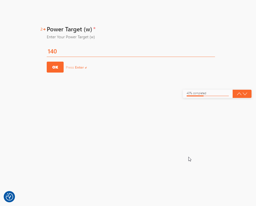 다음 입력 값은 목표 파워. 아마도 평균 파워를 의미하는 것 같다. 자신이 목표하는 평균 파워를 입력하면 된다. 워크아웃을 돌릴 것을 생각하고 평균 파워를 입력한다.
