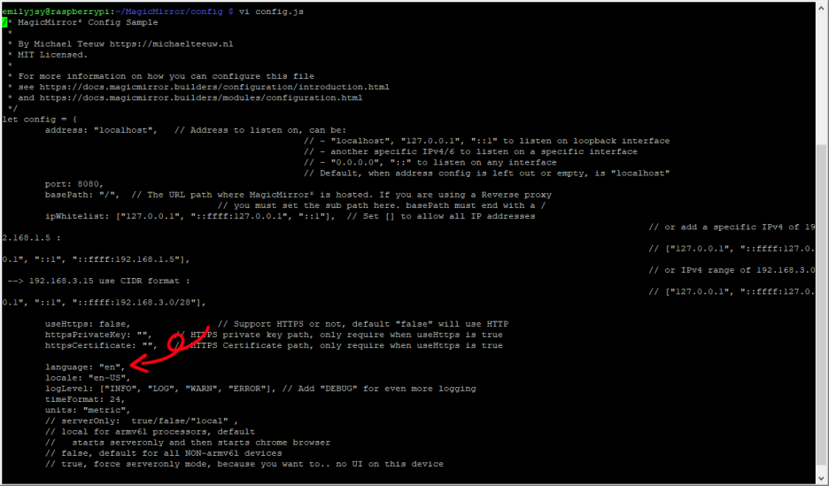먼저 날자 부분이 영어로 나오는 것을 한글로 나오도록 수정해 보자. 리눅스 상의 기본 텍스트 에디터인 vi 툴을 통해 config.js 파일을 열어보자. 그러면 터미널에서 해당 파일을 열어서 보여주는데 아래 스크린샷의 중간 부분에 language: “en”, 이라고 설정된 라인이 있다. config.js 파일은 텍스트 파일로 이 텍스트 파일을 수정하여 설정을 반영할 수 있도록 되어 있다.
