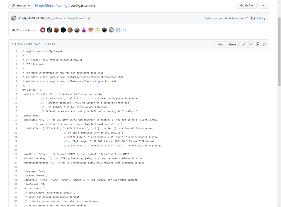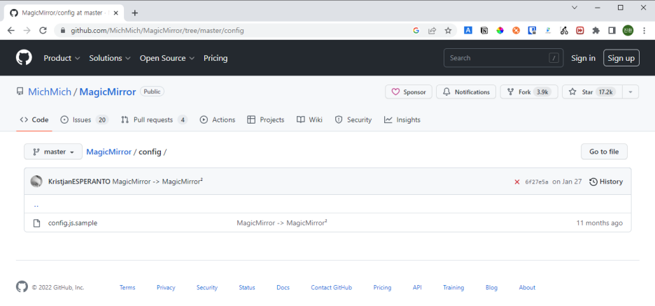 제작자의 git hub 페이지에 접속해 보면 위 스크린샷 처럼 소스코드의 디렉토리 정보를 확인할 수 있고, 우리가 복제한 디렉토리 구조와 동일한 것을 알 수 있다. config 폴더를 클릭하여 들어가면 아래 스샷처럼 config.js.sample 파일만 있는 것을 확인할 수 있는데 우리 config 폴더에는 복사한 config.js 파일을 포함하여 2개의 파일이 있다는 것을 기억할 것이다.