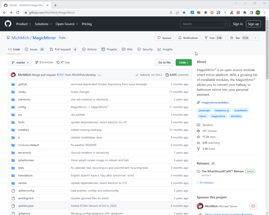 매직미러 소스를 제공하는 제작자의 git hub 페이지는 https://github.com/MichMich/MagicMirror 인데 여기에 방문해 보면 우리가 처음에 git clone 명령어를 통해 복제한 소스 페이지 정보를 확인할 수 있다.
