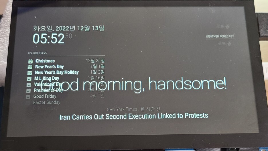 수정이 완료되면 MagicMirror 디렉토리에서 “npm run start” 명령을 입력하고 엔터를 누르면 화면에 매직미러 정보가 표시된다. 그러면 아래 스크린샷 처럼 날자 부분이 영문에서 한글로 변경된 것을 확인할 수 있다.