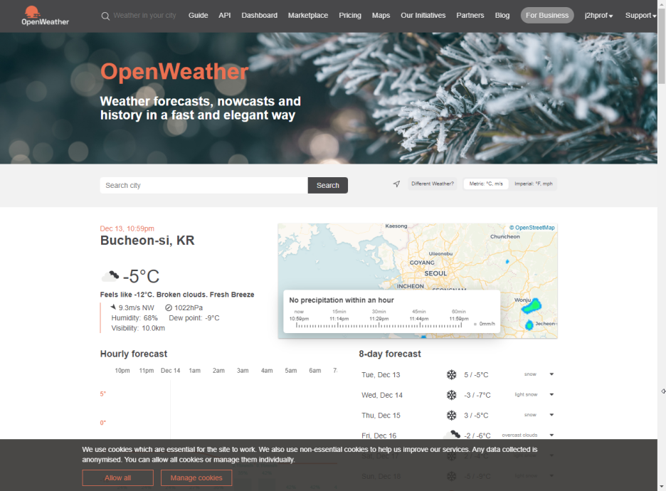 OpenWeather는 날씨에 대한 정보를 서비스해주는 포탈로 API를 통해 날씨 정보를 취득하여 활용할 수 있도록 서비스를 제공한다. 먼저 아래 사이트에 접속하여 회원가입을 하고 로그인을 한다.
