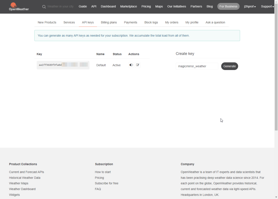 회원가입 후 우리가 필요한 부분은 API를 사용하기 위한 apiKey 정보이다. 기본적으로 회원가입하면 디폴트 apiKey가 생성되어 있는데 라즈베리파이용으로 별도로 생성해 보자.