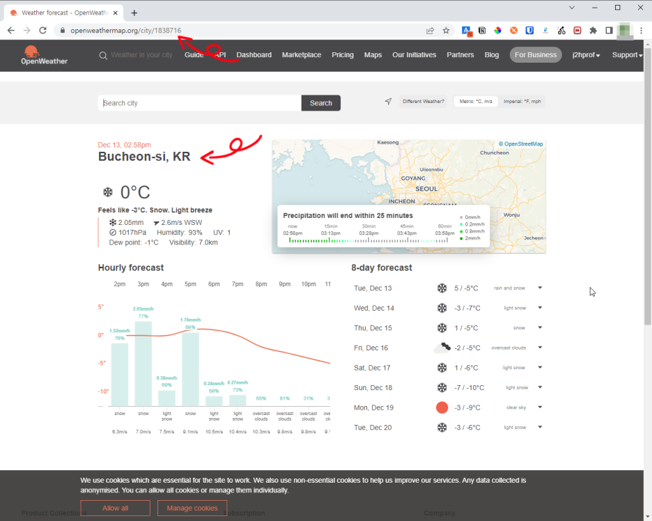 그리고 날씨를 받아올 지역 정보를 아래와 같이 Bucheon이라는 키워드 검색으로 지역 정보를 얻어온다. 지역정보는 “Bucheon-si, KR”이고, 코드는 URL을 보면 1838716 인 것을 확인할 수 있다. 이 정보와 API 정보를 설정파일에 반영하고 서비스를 재시작 한다.