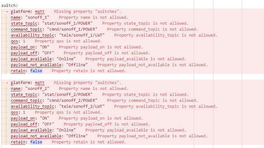 개발자 도구에서 디바이스를 확인해 보니 구성되어 있던 mqtt switch 정보가 모두 사라졌다. configration.yaml에 들어가서 확인해 보니 에러가 아래와 같이 뜬다.