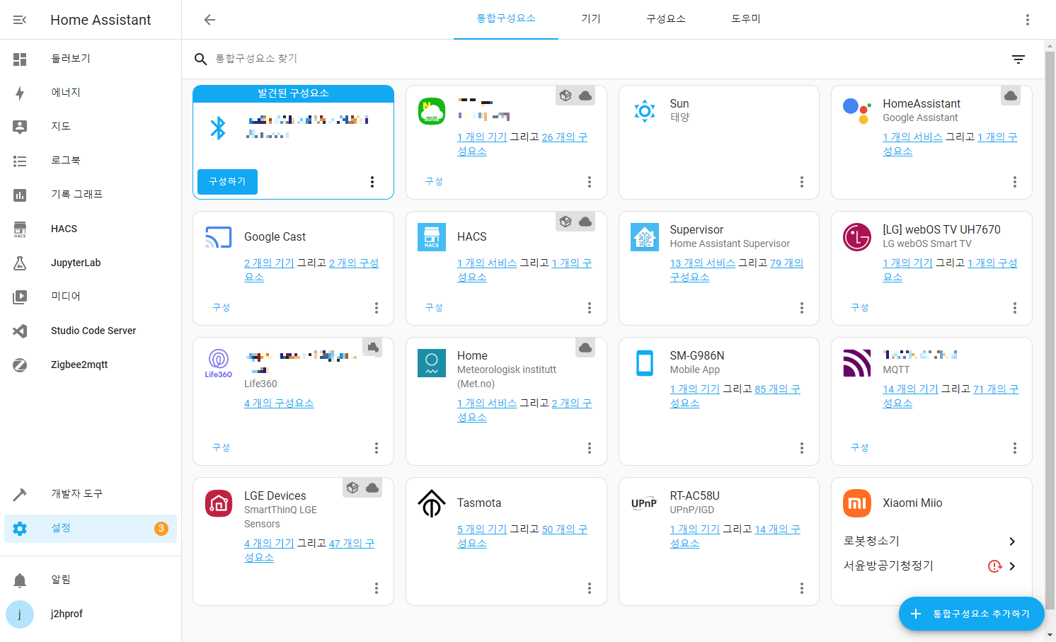 인터넷 검색을 해보니 버전업이 되면서 더 이상 매뉴얼 설정으로 진행하지 않고 자동으로 디바이스를 인식하도록 변경된 듯 하다. 아래의 통합구성요소 추가하기를 통해 Tasmota를 추가하면 되는데 5개의 스위치 중 1개의 스위치만 자동으로 인식된다. 아래 스샷에는 5개 모두 인식되어 있는데 전부 구성하고 스샷을 찍었다.