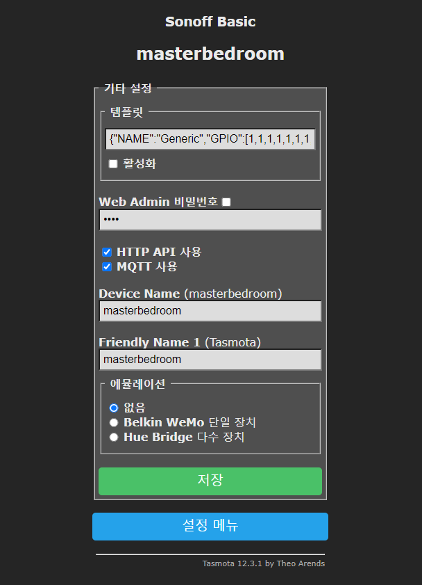 아래 설정에서 Device Name 필드와 Friendly Name 1 필드를 본인이 원하는 이름으로 변경한 후에 스위치를 재시작하면 Home Assistant에서 해당 디바이스를 자동으로 인지한다.