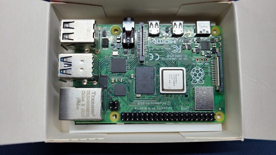 라즈베리 파이 보드를 안전하게 사용하기 위해 라즈베리 파이 전용 케이스에 장착한다. 라즈베리 파이의 측면에 USB 포트가 있는데 초기 OS설정 작업을 위해 USB 키보드와 마우스를 연결한다.