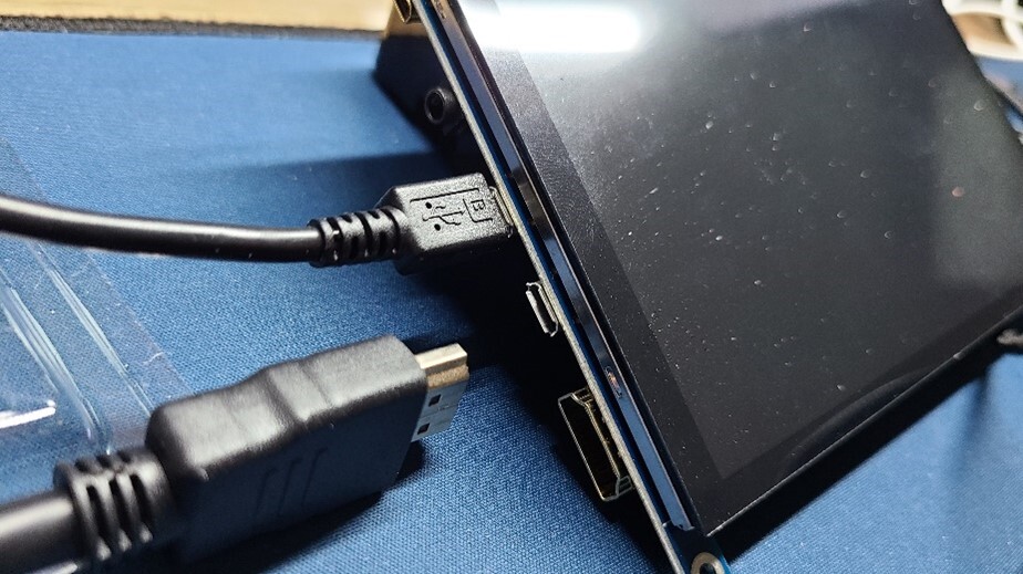 라즈베리 파이 후면부에는 전원단자와 HDMI 단자가 있는데 화면 출력을 위한 소형 스크린을 HDMI 단자를 이용하여 서로 연결한다. 라즈베리 파이의 HDMI 단자는 Mini HDMI 단자이기 때문에 여기서는 HDMI to Mini 컨버터 단자를 연결하여 구성하였다.