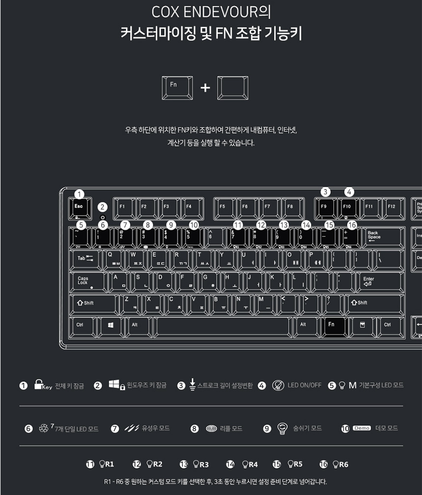 단축키는 스페이스바 우측에 있는 FN 키와의 조합으로 사용이 가능하다. 기본적으로 설정되어 있는 기능키는 아래 이미지와 같다.