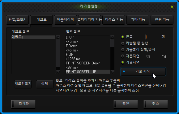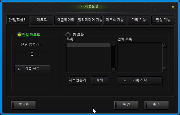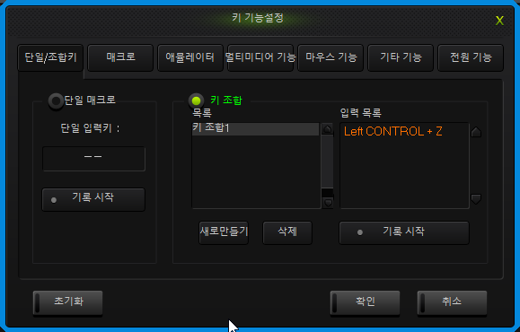 마우스 커서로 Z키를 클릭하면 아래와 같은 팝업 화면이 나타난다. 기본적으로 단일매크로 선택이 되어 있다. 하지만 키 조합을 선택하고 새로만들기를 눌러서 우측의 기록시작 버튼을 클릭 후 원하는 키조합을 입력할 수도 있다. 자신이 원하는 매크로 트리거를 선택할 수 있다. 경험상 특수키와의 조합을 통해서 발동시키는게 좋다.