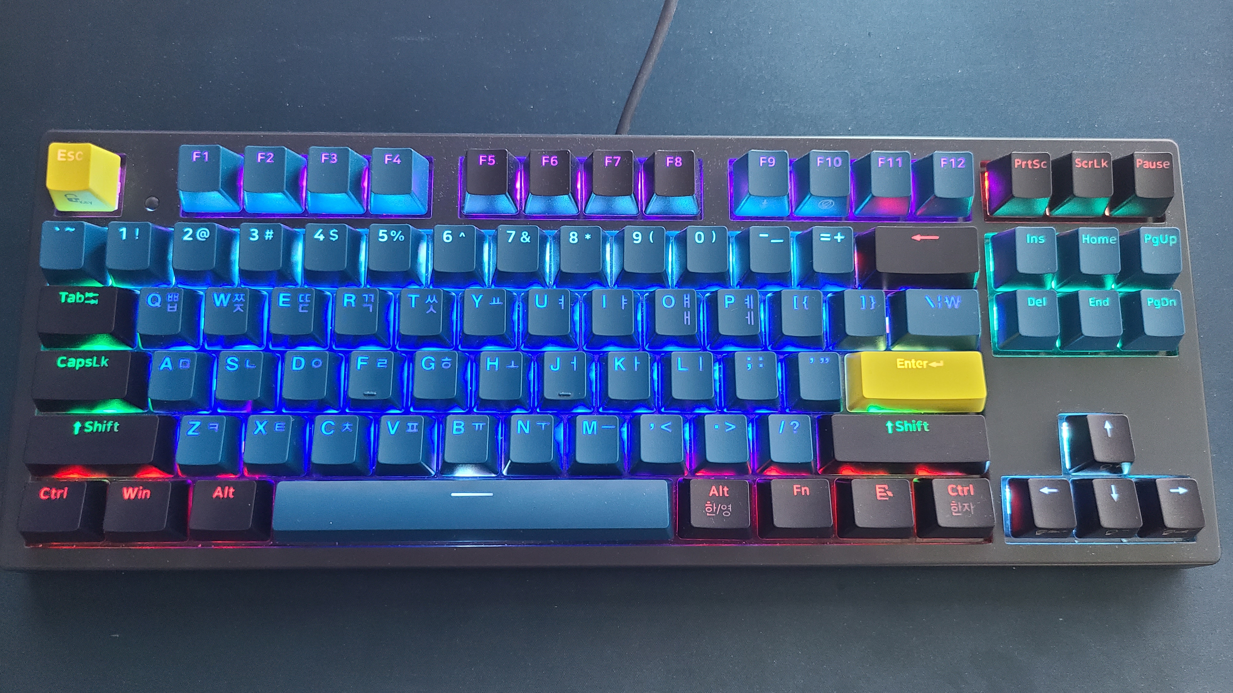 키보드의 백라이트가 기본 백라이트 구성으로 변경됨. 아래의 색상이 기본 백라이트 구성임.