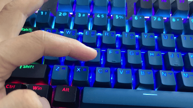 리플모드인데 키보드를 누르면 누른 키보드 주위로 물결처럼 키보드 전체로 물결이 퍼져간다. 첫 번째 모드는 상하좌우로 퍼져나가는 모드이고, 두 번째 모드는 가로줄로 퍼져나가는 모드, 세 번째 모드는 설정을 끈다.